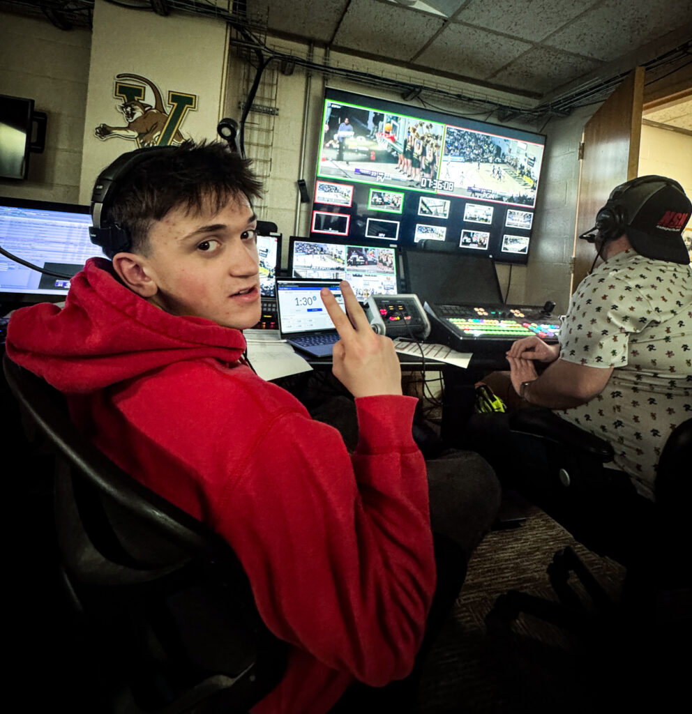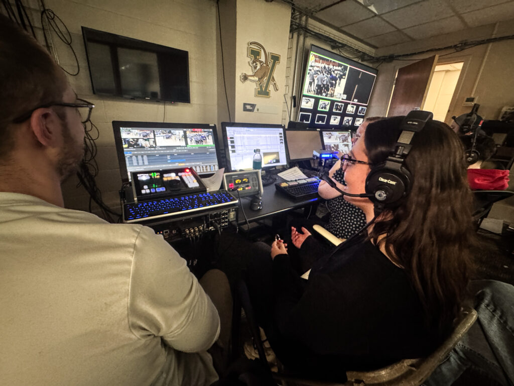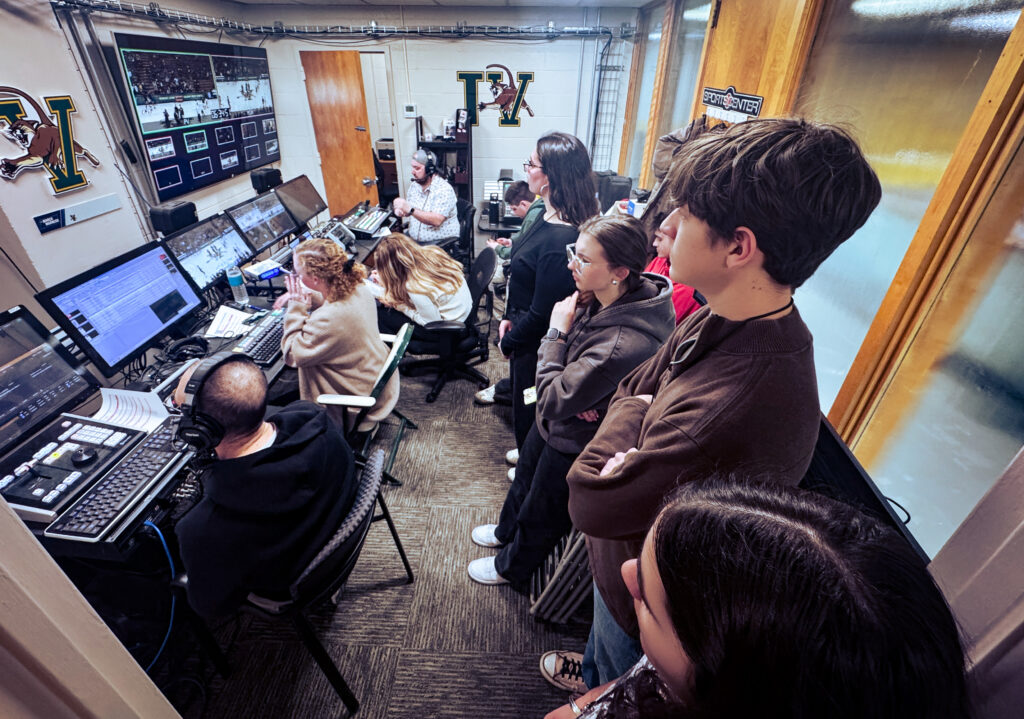 BTC, UVM, and ESPN – Eleventh-grade students in the Digital Media Lab and Design & Illustration programs were able to observe the production process for televising the UVM men’s basketball earlier this week. The game was streaming on the ESPN site and televised on ESPN 3. Students will be going back to engage with the process for UVM men’s hockey on Saturday evening.