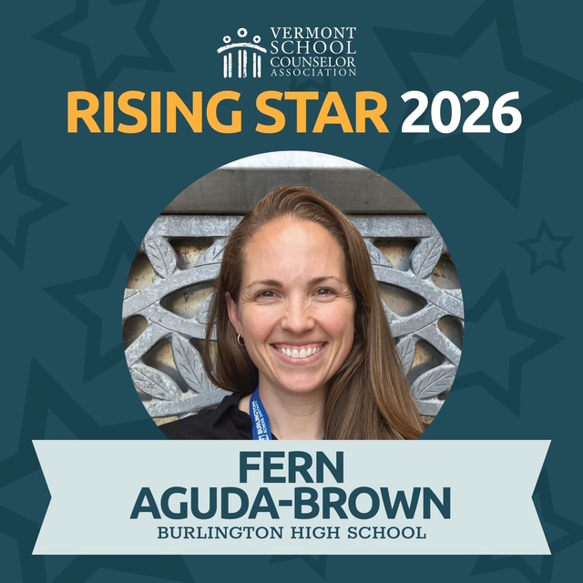 BHS Councilor Honored with the VTSCA Rising Star award – Congratulations to Fern Aguda-Brown! The Vermont School Councilors Association has named Fern a 2026 Rising Star! The award recognizes an individual who has entered the school counseling profession within the last five years who is a model for new counselors, demonstrating the highest standards of professional competence, outstanding contributions to the school community and/or profession, and has demonstrated strong rapport with students, parents/guardians, and school personnel. We are lucky to have Fern with us!